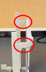 Trim the ends of the water arm stoppers with nippers. Glue them to the underside of the water arm, ensuring correct orientation before bonding.