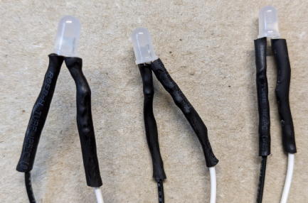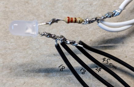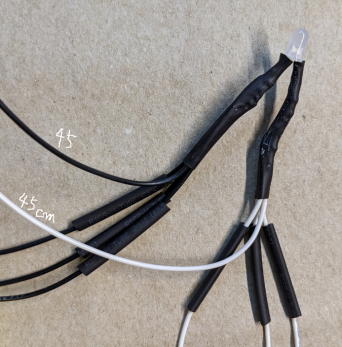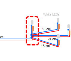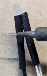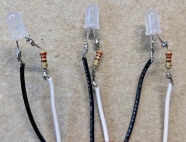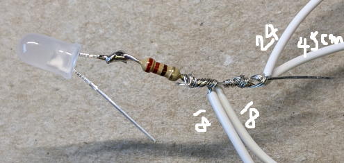 Solder 220Ω registers to white LEDs. Solder 18 or 24 cm wires to the opposite lead of the resisters and cover with heat-shrink tubing.