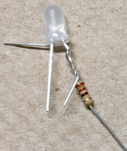 Twist a 220Ω resistor to the anode lead (longer one) of the LED for temporary fixation and solder it.