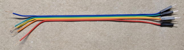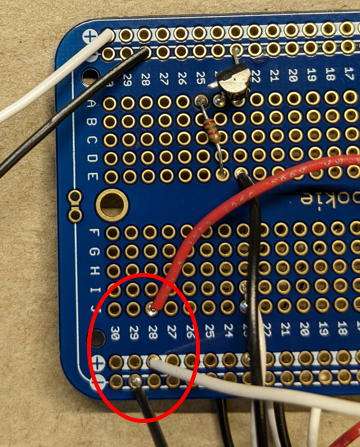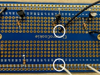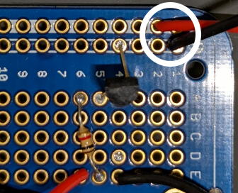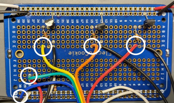 Solder each jumper wire to its corresponding line on the board as shown below.
