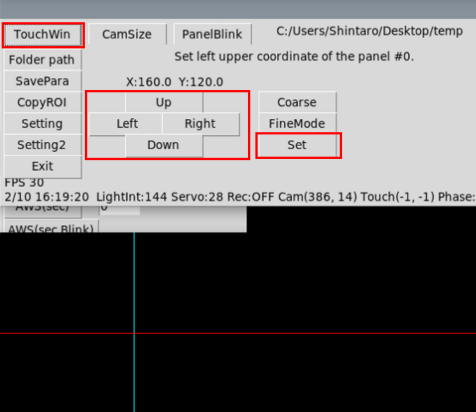 If touch window is not displayed, click "TouchWin" button. You'll see a cross-hair. You can move it with Up/Rright/Left/Down buttons. The step can be altered by clicking "Coarse" and "FineMode" button.