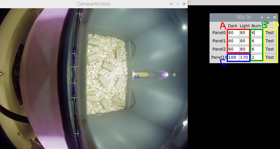 Next, adjust nosepoke detection ROIs. Move ROIs to the appropriate positions as shown below (#0-2: above the mask hole bottom of left/center/right panel, #19 above water slit bottom).