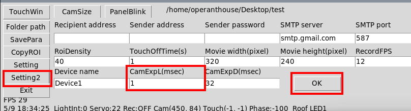 "Camera exposure Light" is an exposure time during the light phase, and "Camera exposure Dark" is an exposure time during the dark phase. Larger values will make the captured image brighter. Adjust the values of the CamExpL and click the "OK" button to reflect the change. Repeat this until the image appear as desired (you can also enter decimal values here).