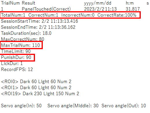 Modify the session termination process. Because there is a right and wrong response, addIncorrectNumandTrialNum.Also calculate thecorrect rate and record it to the result text. Add lines to record new task parameters (MaxTrialNumandPunishDur).