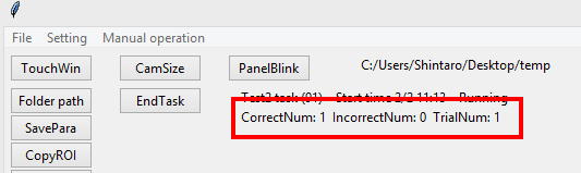To count the number of touching (= trial number), increase the TrialNum when DetectRoiNosepoke() returns a value other than -1 and 19(-1 is returned when there is no ROI detecting. 19 is returned when the water slit ROI detects the animal).