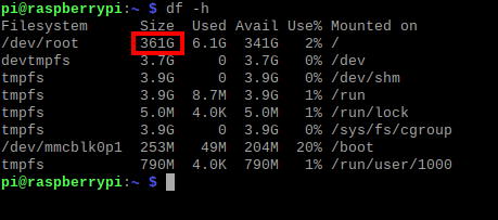 7. Insert the destination SD card to the Raspi. The space of the copied card would be recognized as 16GB so next expand it to the maximum. Open the terminal and enter the following command,