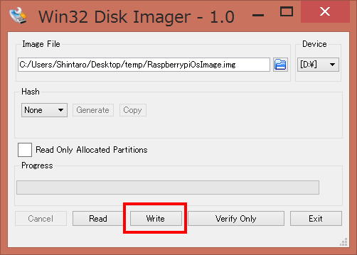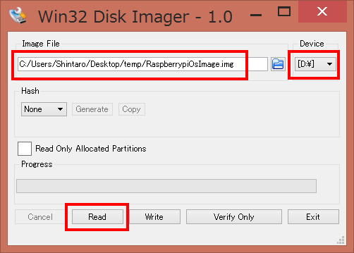 5. Connect the SD card through USB. Select the .img file you just created as "Image File" and specify the SD card as "Device". Then click the "Read" button.