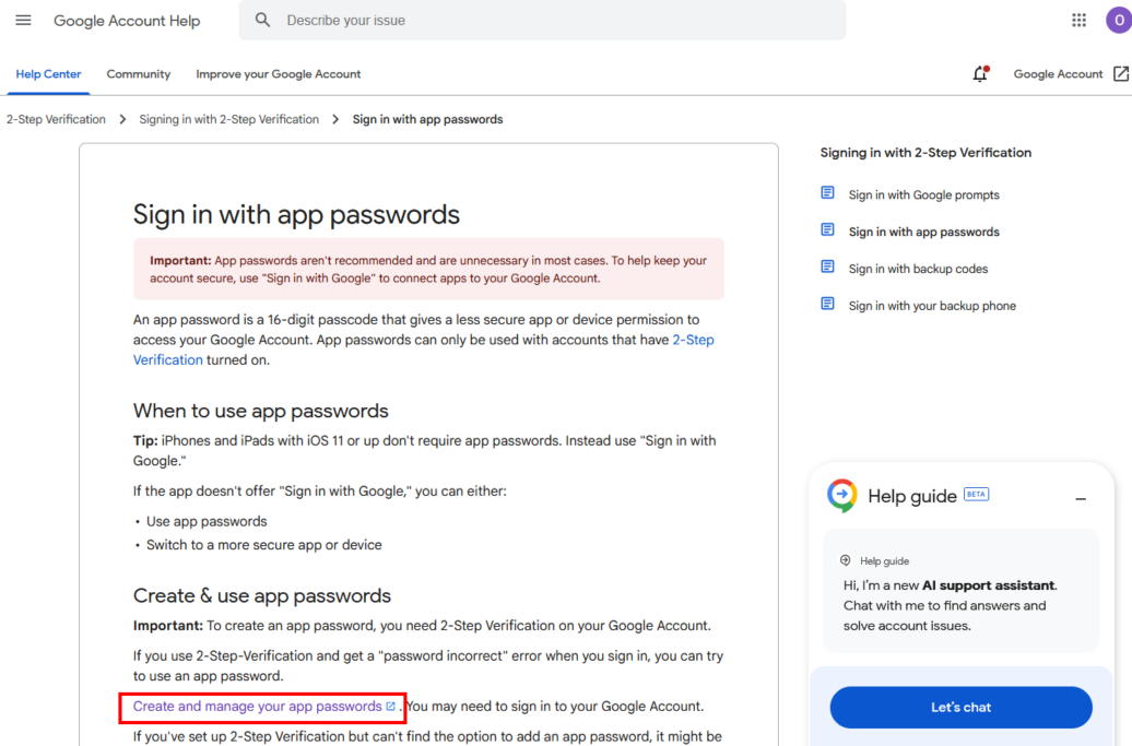 If you cannot access this page, search for it using keywords such as “Google account app password.”