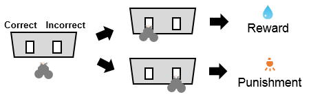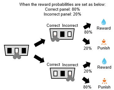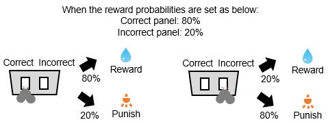 This task presents correct and incorrect panels. The difference from the spatial discrimination is that neither the correct and incorrect panel touching result in reward and punishment respectively at 100%. By setting the probability closer to 50%, it would become more difficult to adapt subject's behavior when the correct and incorrect panels are switched.