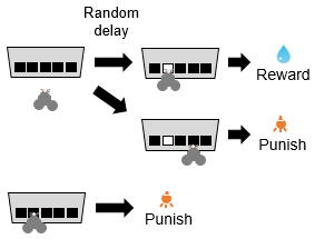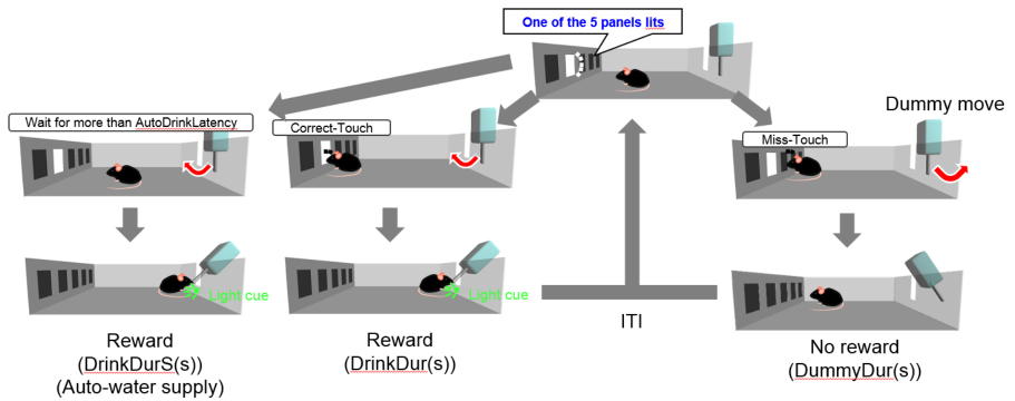 After a certain delay, randomly chosen panel is lit up for a certain time. The subject receives a reward when it touches the lit panel. All the other touches are punished. For the homecage analysis, there is an option to make it possible to start a trial when the subject nosepoke the water nozzle slit (This function is needed to avoid running the task while the animal is sleeping or eating food).