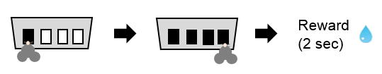 In Go task, a panel is lit for a certain time and if the subject touches it before it disappears, the subject receives water reward. No-Go task is normally performed after learned the Go task. In this task, the subject gets the reward when it withholds from touching the lit panel for a certain time.