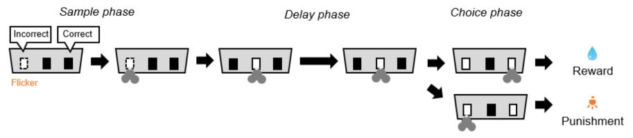 This is a widely task to measure working memory from rodent to human. The subject is required to remember the position of the touched panel for a certain delay and chose the same panel (DMTP) or opposite panel (DNMTP) at the choice phase. To prevent the subject from using their body location as a cue, they are required to touch the center panel just before and after the delay.