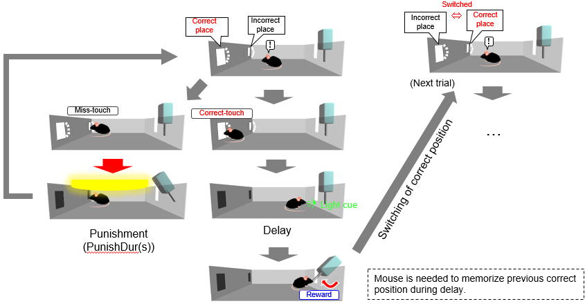 Seed: A seed of random. It generates random pattern of correct panel position from the integer entered here so if you want to perform tasks with identical random pattern between mice, enter the same number. (Any integer)